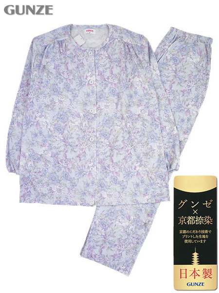 グンゼのレディース長袖パジャマ、グンゼ×京都捺染。京都のこだわり技術でプリントした生地を日本で縫製しています。おしゃれな花柄の日本製パジャマです。素材は風合いが良くソフトな肌ざわりが特徴のスムース素材を使用しています。袖、足口ゴム通し穴付き。上衣:襟なしの前開き、袖口絞り、ポケットなし。パンツ:裾口ストレート、ポケットなし、ウエストゴム取替口あり。