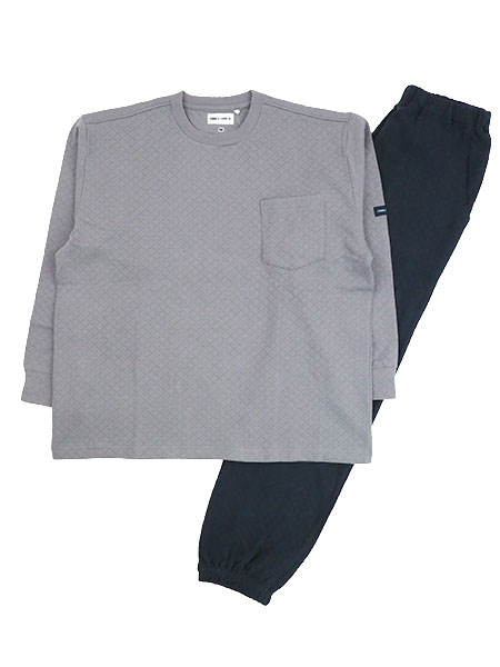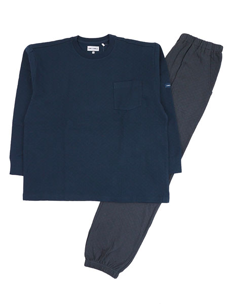 GUNZE(グンゼ)COMME CI COMME(コムシコムサ)のメンズパジャマ。本体には、表裏綿100%(肌に当たる部分は綿100%)のふんわり膨らみ感があるダイヤキルト素材を使用。寒い季節に適した保温性のある暖かい素材です。上衣:トレーナータイプ、襟ぐりリブ、袖口切替、左胸にポケット付き、左袖にロゴのワンポイント。パンツ:前とじ、裾ゴム入り、両サイドにポケット付き、ウエストゴム取り替え口付き。