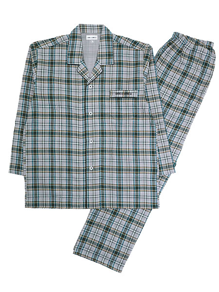 グンゼのコムシコムサ、メンズの前あきパジャマ。先染めチェック柄、綿100%ダブルガーゼ素材のシャツパジャマです。ダブルガーゼ素材だから通気性がよく吸湿性にも優れています。肌あたりもよく快適な着心地なので父の日のプレゼントにもおすすめです。上衣:テーラー襟の前開き、左胸にポケット付き、ポケットにロゴ刺繍入り。パンツ:前とじ、ポケットなし、ウエストゴム取り替え口付き。