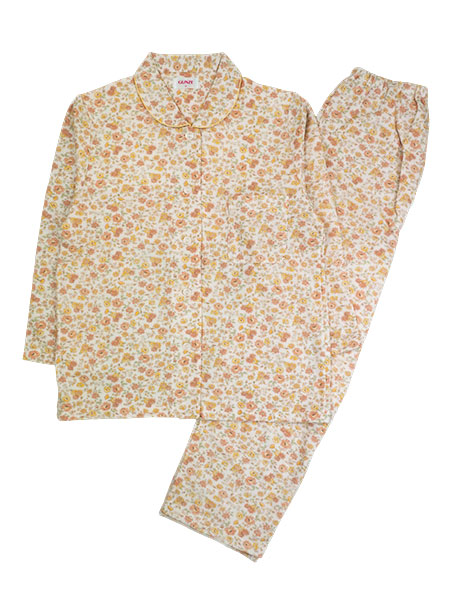 GUNZE(グンゼ)HOTMAGIC(ホットマジック)のレディース長袖パジャマ、肩とももW保温。ふんわり軽やかな着心地のソフトキルト素材を使用した冬用の暖かいパジャマです。冷えやすい肩とももにグンゼオリジナルの吸湿発熱ガーゼを使用。ダブル保温であったか快適です。花柄プリント。袖口・足口ゴムにゴム通し穴付きなのでゴムを通して、ゴム絞り仕様にアレンジも可能です。上衣:襟付き、前あき、筒袖、左胸にポケット付き。パンツ:裾ストレート、ポケットなし、ウエストゴム取り替え口付き。
