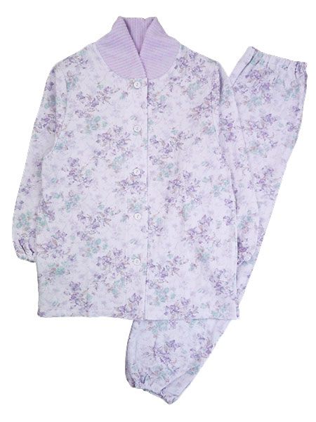 GUNZE(グンゼ)レディース長袖パジャマ、襟元保温。襟元の起毛素材で冷えやすい首元を包み外気が入りにくい快適保温。本体はふんわり暖かいソフトキルト素材です。表裏の生地の間に中わたを挟み込んで編んでいるため保温性が高く、秋冬に適した素材です。花柄プリント。袖口・足口ゴム絞り仕様でゴム通し穴付き。上衣:立ち襟、前あき、袖口ゴム絞り、ポケットなし。パンツ:裾ゴム絞り、ポケットなし、ウエストゴム取り替え口付き。