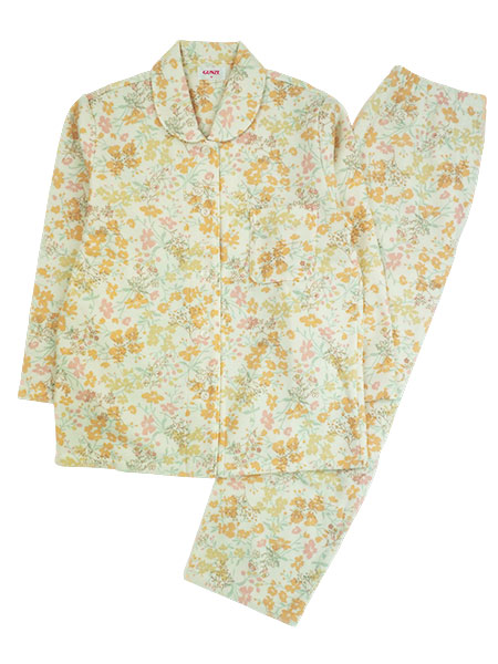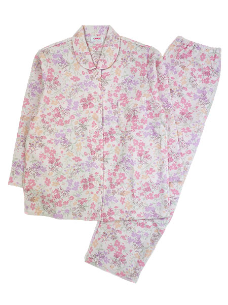 GUNZE(グンゼ)極暖、レディース長袖パジャマ、裏起毛。肌側起毛で柔らかく暖かい。ふんわり厚手、寒い季節におすすめのパジャマです。袖口・足口ゴムにゴム通し穴付きなのでゴムを通して、ゴム絞り仕様にアレンジも可能です。花柄プリント。上衣:襟付き、前あき、筒袖、左胸にポケット付き。パンツ:裾ストレート、ポケットなし、ウエストゴム取り替え口付き。