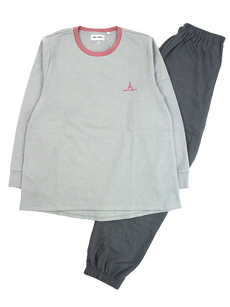 GUNZE(グンゼ)COMME CI COMME CA(コムシコムサ)のレディースパジャマ。肌ざわりがよく暖かい綿混の裏毛起毛素材を使用したパジャマです。上下無地のシンプルなルームウエアでトップスのロゴプリントがアクセントになっています。上衣:トレーナータイプ、襟周りリブ、袖口切替、左胸にロゴプリント、裾の後ろ身丈が長めでラウンドカット、ポケットなし。パンツ:裾ゴム入り、ポケットなし、ウエストゴム取り替え口付き。