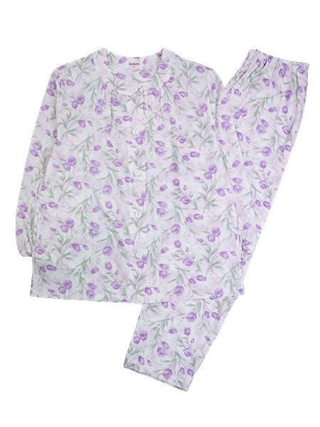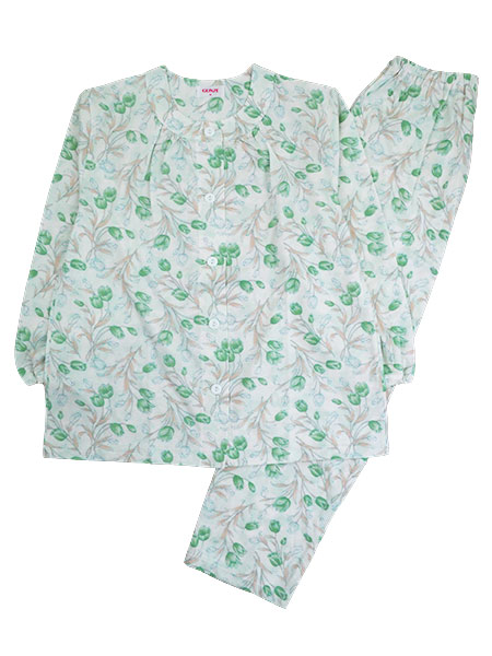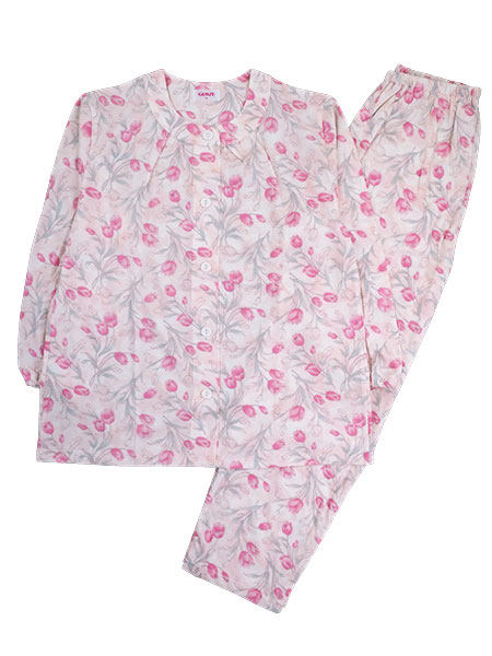 GUNZE(グンゼ)レディース長袖パジャマ、保湿加工&抗菌防臭加工、花柄。春夏に適した薄手ニット素材の綿100%天竺生地にグンゼオリジナルの保湿加工と抗菌防臭加工を施しています。なめらかな肌ざわり、ニオイの元になる細菌の増殖を抑制します。袖・足口にゴム通し穴付き。上衣:前あき、袖口ゴム絞り、ポケットなし。パンツ:裾ストレート、ポケットなし、ウエストゴム取り替え口付き。