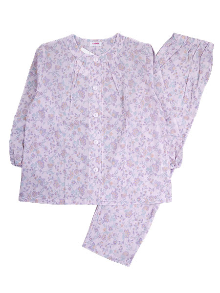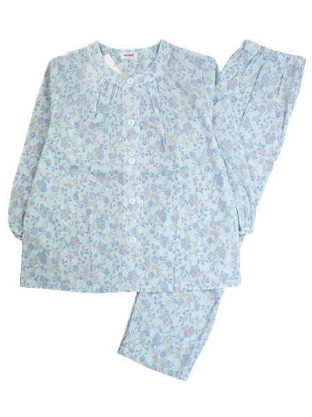 グンゼのレディース長袖パジャマ、さわやか涼感。着脱しやすい大きめボタン。製品本体に京都でプリントした日本製生地を使用したベトナム製のパジャマ。汗ばむ夏にサラッとした快適な肌ざわりの綿100%楊柳素材。袖口・足口にゴム通し穴付き。上衣:前開き、ポケットなし、袖口ゴム絞り。パンツ:長パンツ、ポケットなし、ウエストゴム取替口あり。