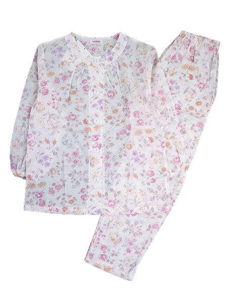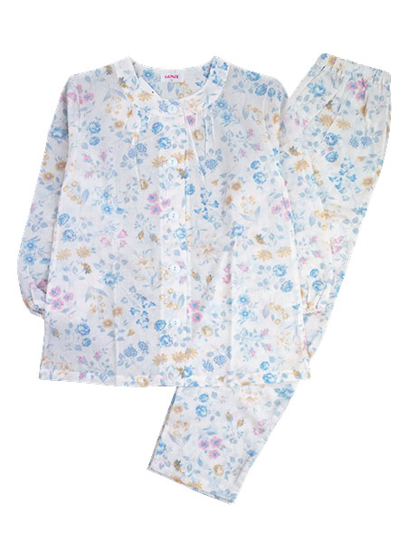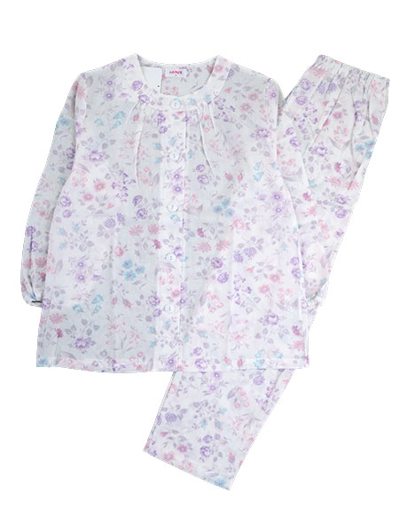 グンゼのレディース長袖パジャマ、さわやか涼感。着脱しやすい大きめボタン。製品本体に京都でプリントした日本製生地を使用したベトナム製のパジャマ。汗ばむ夏にサラッとした快適な肌ざわりの綿100%楊柳素材。袖口・足口にゴム通し穴付き。上衣:前開き、ポケットなし、袖口ゴム絞り。パンツ:長パンツ、ポケットなし、ウエストゴム取替口あり。