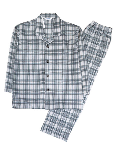 GUNZE(グンゼ)メンズ長袖パジャマ、グンゼ×京都捺染、着脱しやすい大きめボタン。製品本体は京都でプリントした日本製生地を使用し、ベトナムで縫製しています。中わたの暖かい空気の層で優しく保温、ふんわり柔らかソフトキルト素材。チェック柄プリント。袖口・足口ゴムにゴム通し穴付きなのでゴムを通して、ゴム絞り仕様にアレンジも可能。上衣:テーラー襟の前あき、大きめボタン、左胸にポケット付き。パンツ:前あき、ポケットなし、ウエストゴム取替口あり。