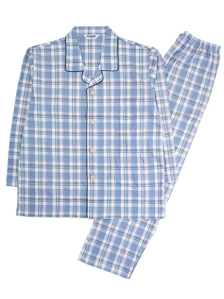 GUNZE(グンゼ)メンズ長袖パジャマ、部屋干し対応、制菌加工。春夏に適した薄手ニット素材の天竺生地を使用しています。屋外干しを避けたい季節におすすめ、部屋干し対応のパジャマです。特定の嫌なニオイの原因菌の増殖を抑制する加工を施しています。こだわりの素材・縫製・設計のグンゼこだわりパジャマ。チェック柄プリント。上衣:テーラー襟の前あき、左胸にポケット付き。パンツ:前あき、ポケットなし、ウエストゴム取り替え口付き。