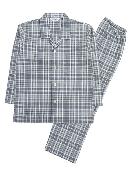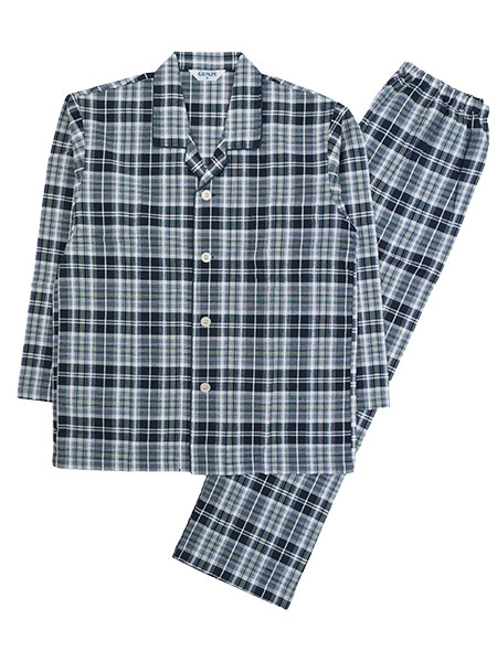 GUNZE、COOLMAGICのメンズパジャマ、サラッとさわやか吸汗速乾、チェック柄。かいた汗を吸って拡散・乾燥させるグンゼオリジナルの綿100%吸汗速乾加工の夏向きパジャマ。汗をかいても乾きやすく爽やかな着心地です。素材はさらっとした肌ざわりが快適な先染サッカー素材を使用しています。上衣:テーラー襟の前あき、左胸にポケット付き。パンツ:前あき、ポケットなし、ウエストゴム取り替え口付き。
