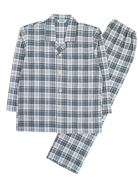 GUNZE、COOLMAGICのメンズパジャマ、サラッとさわやか吸汗速乾、チェック柄。かいた汗を吸って拡散・乾燥させるグンゼオリジナルの綿100%吸汗速乾加工の夏向きパジャマ。汗をかいても乾きやすく爽やかな着心地です。素材はさらっとした肌ざわりが快適な先染サッカー素材を使用しています。上衣:テーラー襟の前あき、左胸にポケット付き。パンツ:前あき、ポケットなし、ウエストゴム取り替え口付き。