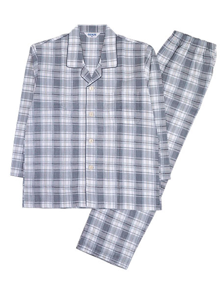 GUNZE、COOLMAGICのメンズパジャマ、サラッとさわやか吸汗速乾、チェック柄。かいた汗を吸って拡散・乾燥させるグンゼオリジナルの綿100%吸汗速乾加工の夏向きパジャマ。汗をかいても乾きやすく爽やかな着心地です。素材はさらっとした肌ざわりが快適なナチュラルクレープ素材を使用しています。上衣:テーラー襟の前あき、左胸にポケット付き。パンツ:前あき、ポケットなし、ウエストゴム取り替え口付き。