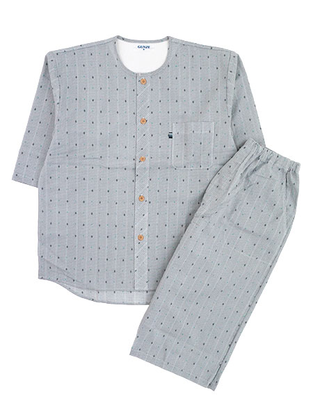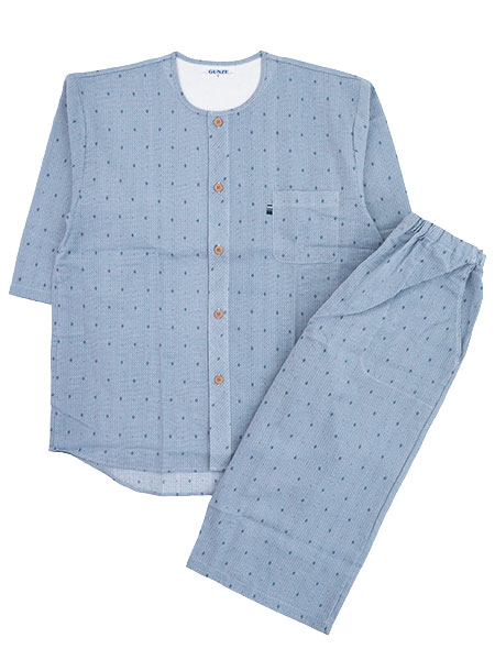 グンゼのメンズ7分袖・7分丈パンツパジャマ、寝るテコ。小紋柄プリントの夏向きリラクシーウエアです。素材はさらっとした肌ざわりが快適な綿100%のクレープ素材を使用しています。上衣:襟なしの前あき、7分袖、左胸にポケット付き、後ろ身頃が船底カットで前より少し長め。パンツ:7分丈、前あき、両サイドにポケット付き、ウエストゴム取り替え口付き。