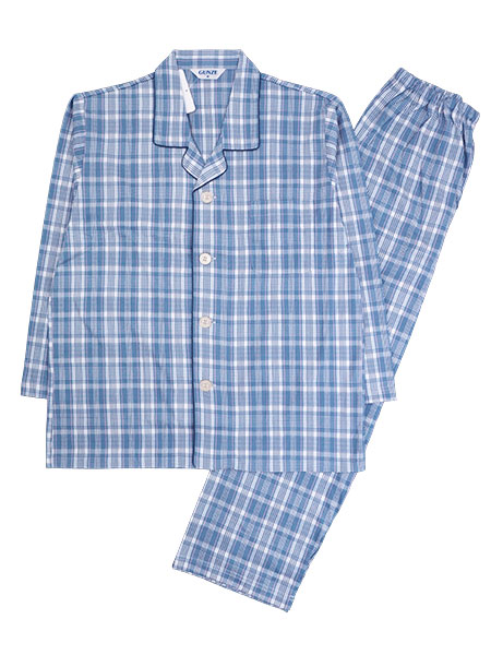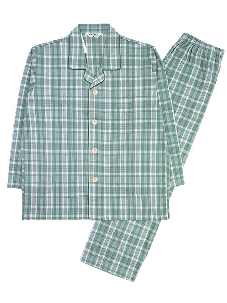 GUNZE(グンゼ)メンズ長袖パジャマ。着脱しやすい大きめボタン、グンゼ×京都捺染。製品本体は京都でプリントした日本製生地を使用し、ベトナムで縫製しています。お肌にやさしい綿100%。素材は伸縮性に優れた薄手ニット地の天竺素材を使用しています。袖口・足口にゴム通し穴付きなのでゴムを通して、ゴム絞り仕様にアレンジも可能。上衣:テーラー襟の前あき、左胸にポケット付き。パンツ:前あき、ポケットなし、ウエストゴム取り替え口付き。