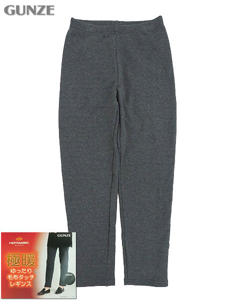 GUNZE(グンゼ)HOTMAGIC(ホットマジック)のレディース極暖ゆったり毛布タッチレギンス。裏側がぬくぬく毛布タッチでとっても暖かな冬用厚地レギンス。寒さ対策におすすめです。お腹周りゆったり仕様(ソフトゴム仕様)。生地が伸びて動きやすい。なめらかソフトタッチ。極厚素材でしっかり保温。裏起毛、10分丈。