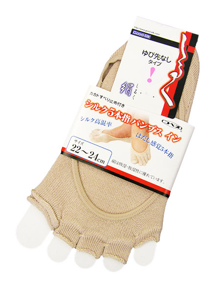 シルクのレディース5本指パンプスイン(指先無)のフットカバーです。シルク高混率。はだし感覚の5本指で、かかとすべり止め付き。指先の無いタイプです。