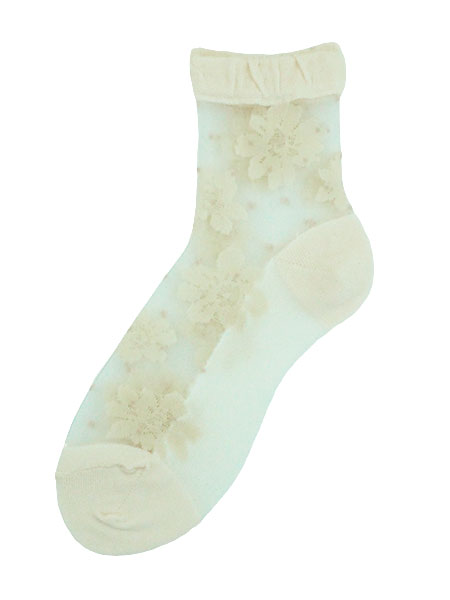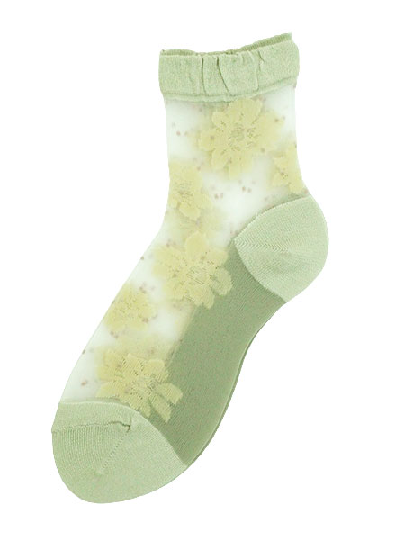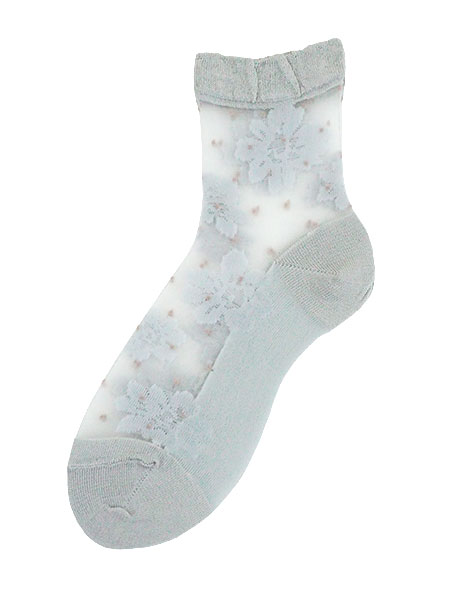 シースルー部分に花とドット柄がデザインされた、足底付きの日本製靴下。
