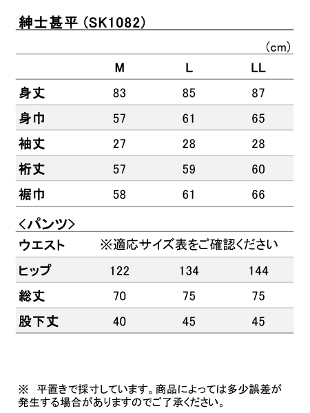 上衣:打ち合わせひも調節、左側ポケット付き、裾両サイドカット(深さ約15cm)。